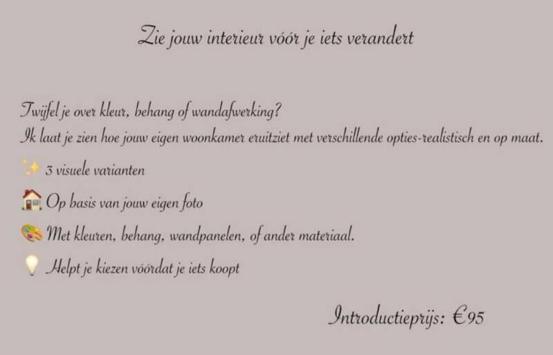 Neem contact op met harmoniestyling.nl om uw wensen te bespreken. Ik maak vervolgens een offerte op maat en na akkoord gaan we aan de slag met uw 2D tekening, moodboard en kleurenpalet.