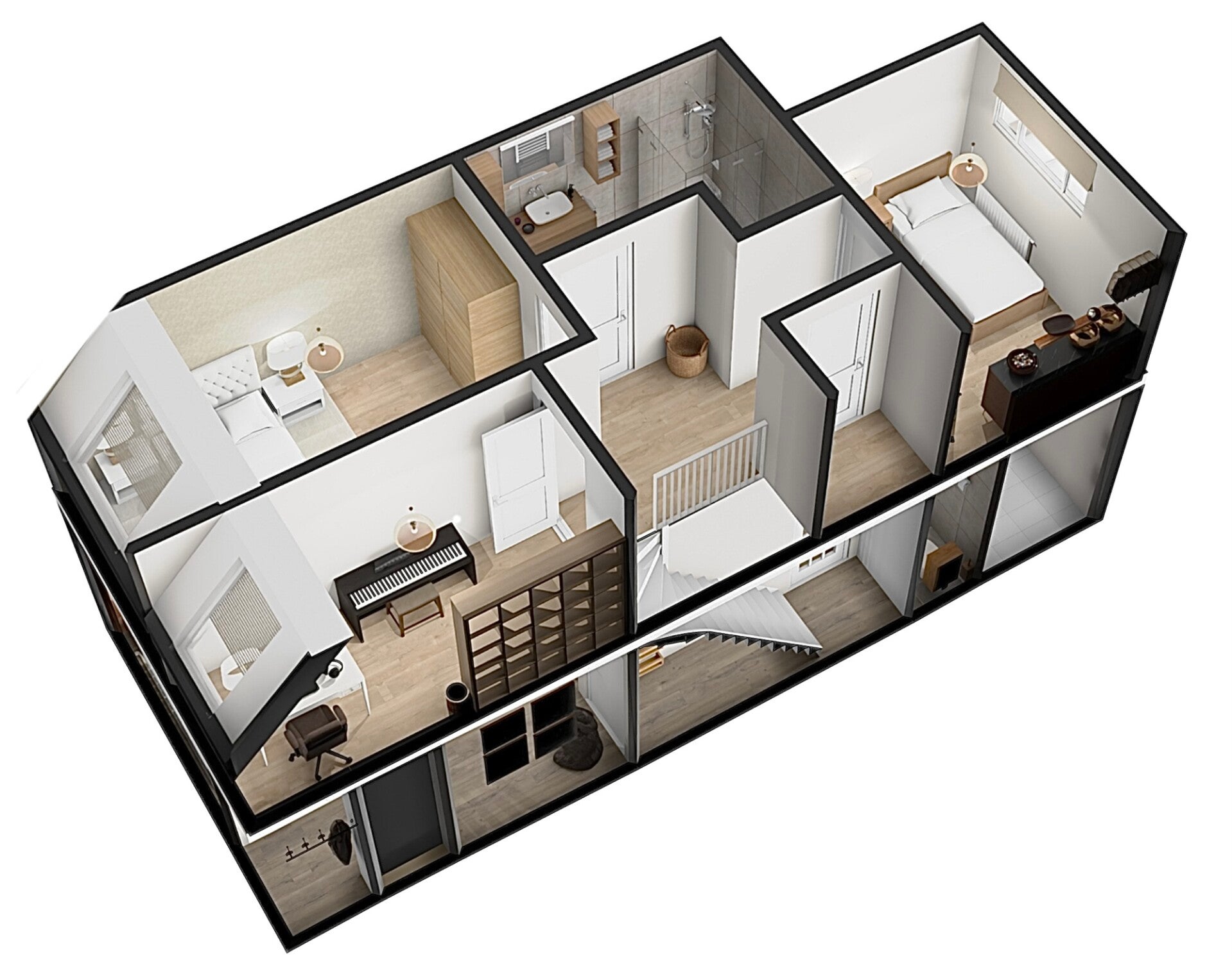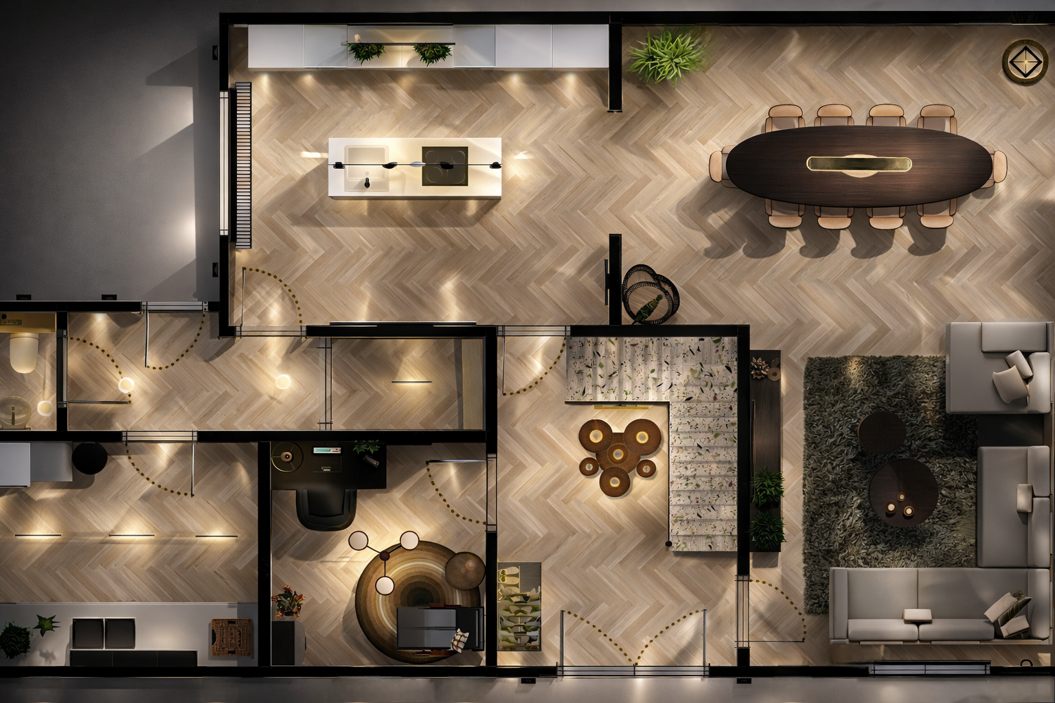 | 3D Visualisatie Realistische 3D-weergave van de ruimte, inclusief meubels en materialen. |